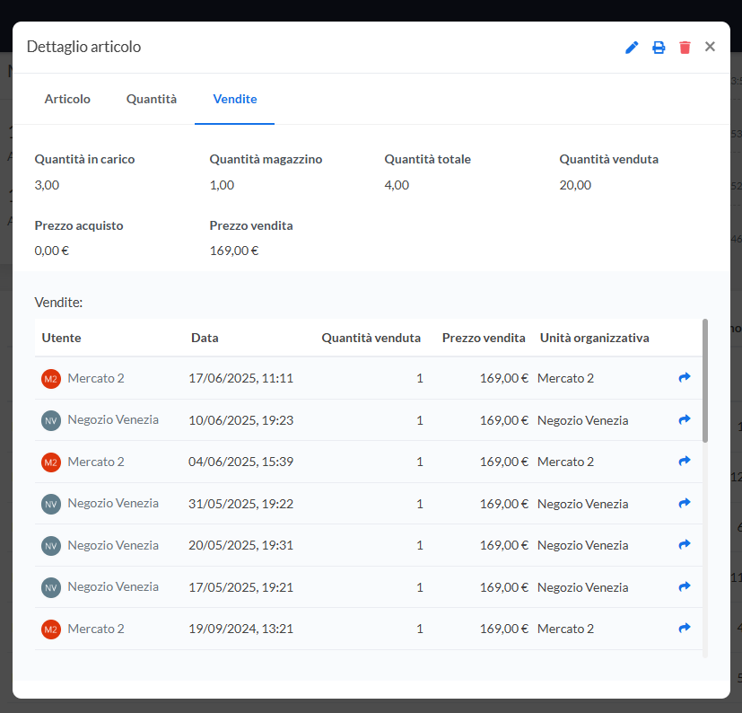 Domandati quali negozi vendono di più un certo articolo e ottieni subito una risposta. Accedendo alla scheda di un prodotto, hai a disposizione l'elenco dettagliato di tutte le vendite effettuate nel tempo. Monitora le performance, controlla le date e gli utenti associati a ogni vendita per avere una comprensione profonda delle dinamiche del tuo inventario e ottimizzare le tue strategie commerciali.
